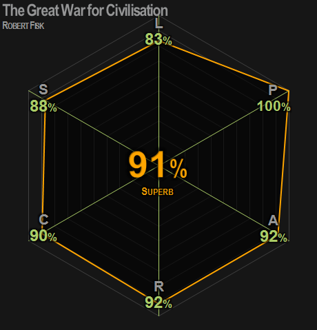 Like Bury My Heart at Wounded Knee, this is the agonising tale of humanity bravely told. Fisk displays the full range of his encyclopaedic knowledge of the Middle East, knowledge gained by 30 years of first hand experience on the front line of pretty much every conflict the area has seen in that time. Many would struggle to write this even if we had the world’s greatest libraries at our fingertips. Fisk managed it without even using the Internet (something he despises).