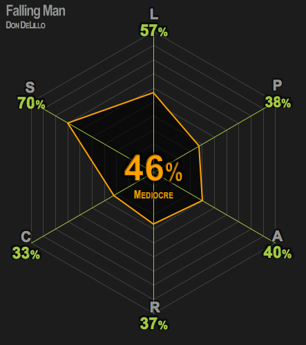 Thankfully, it’s about the same length as White Noise. Had it been as long as Underworld, it would have been very, very tedious. DeLillo loves to play around with structure. Whereas in Underworld he did that to the detriment of the entire novel, here it kind of works because he’s chosen a subject which lends itself to fragmented structure: the life of a Keith, a 9/11 survivor.